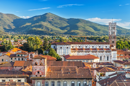 Vivid rooftops of city Lucca with background of colorful green mountains range, Italy.